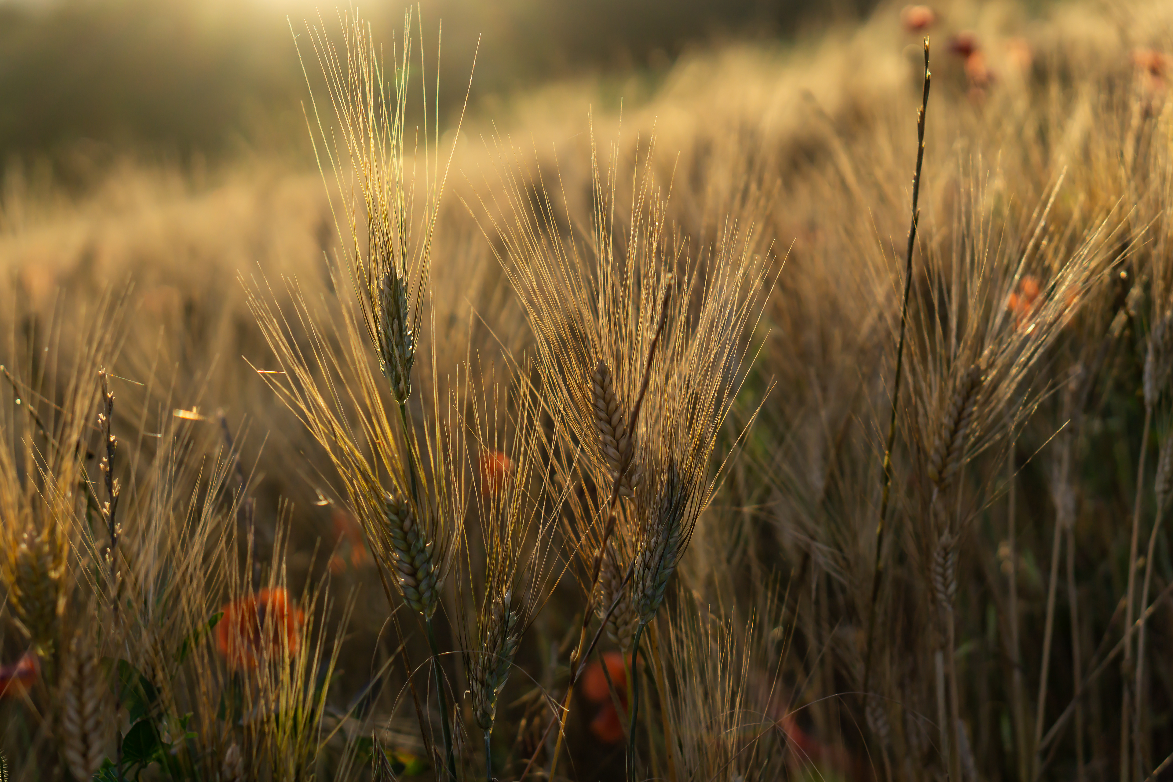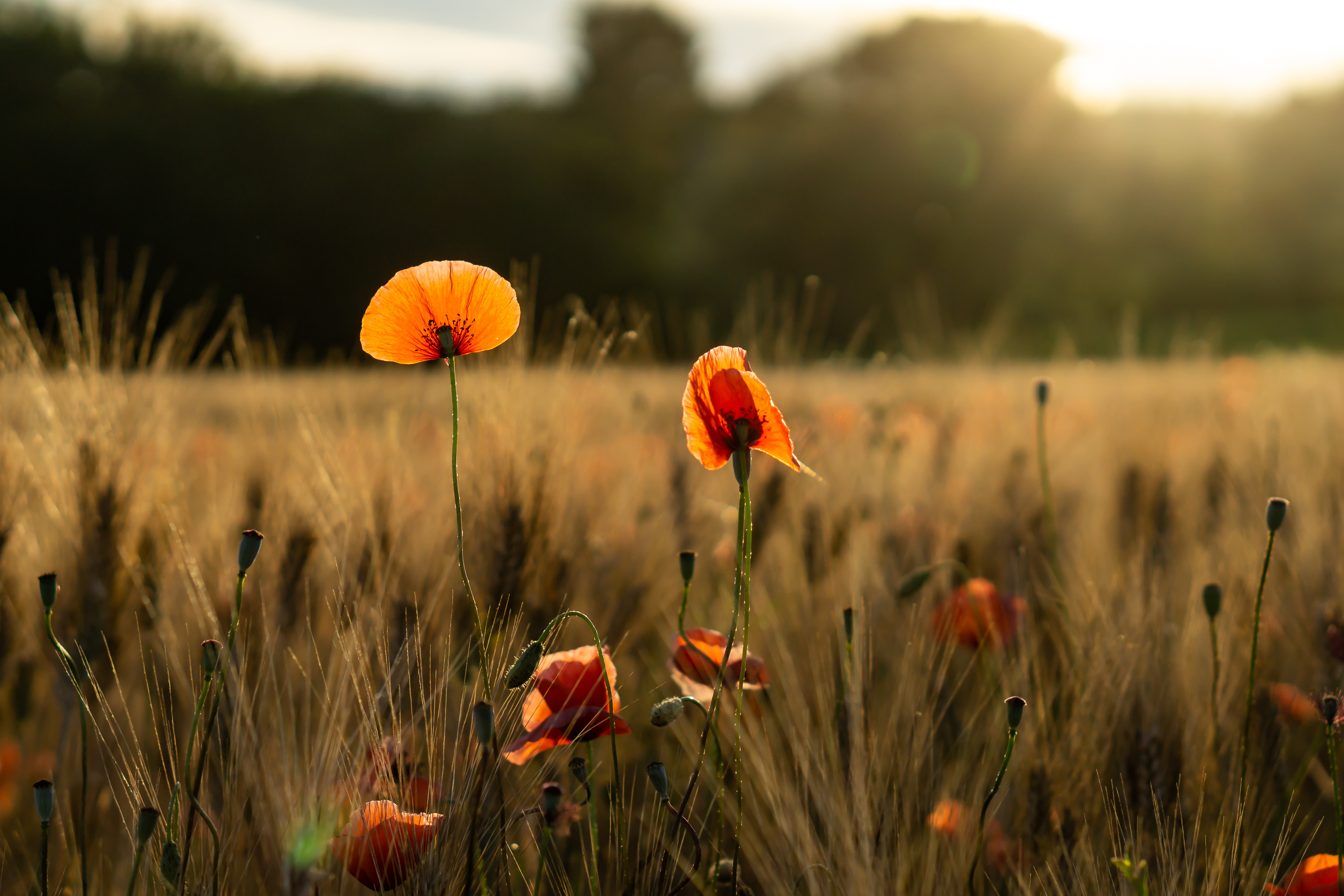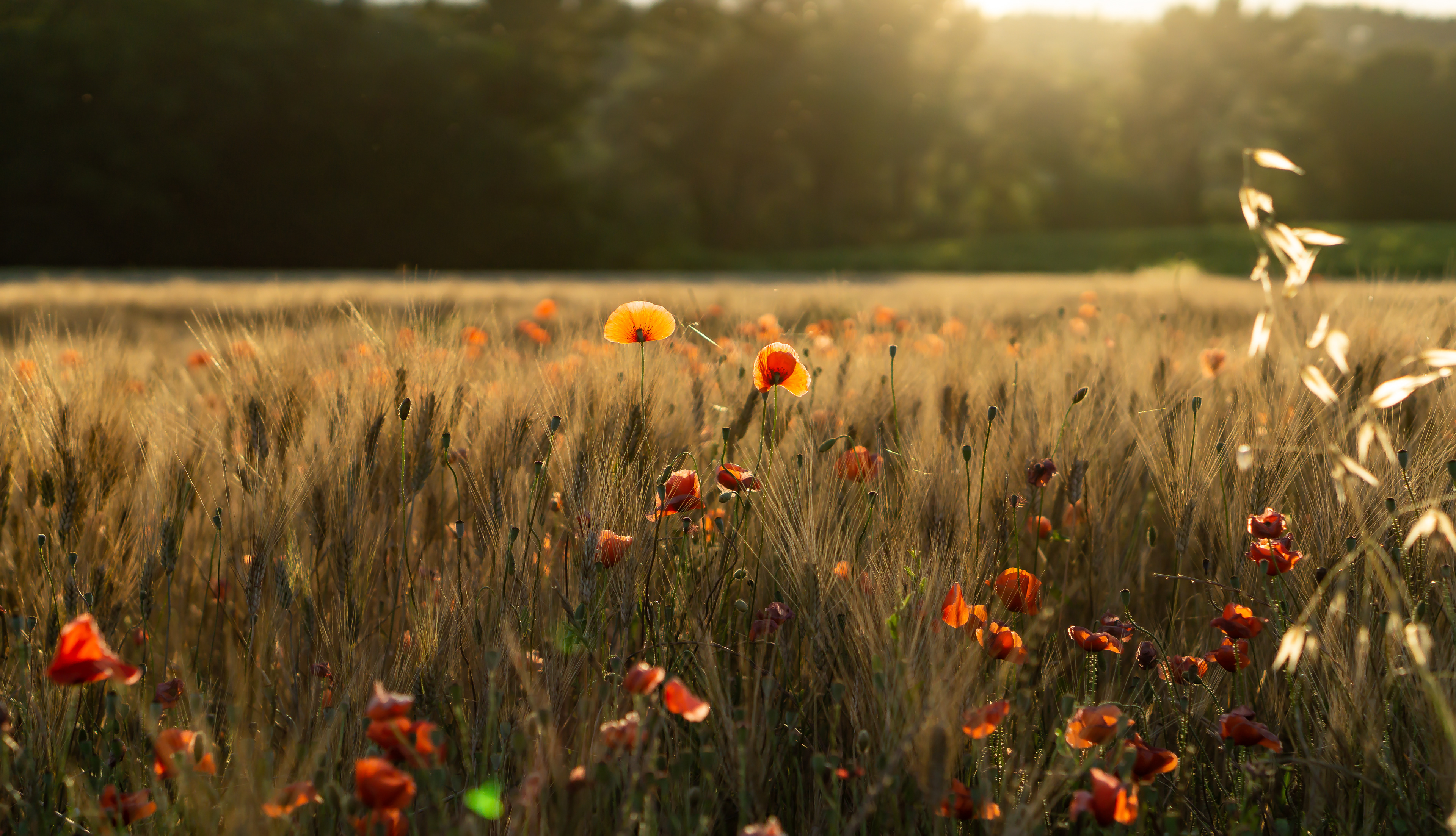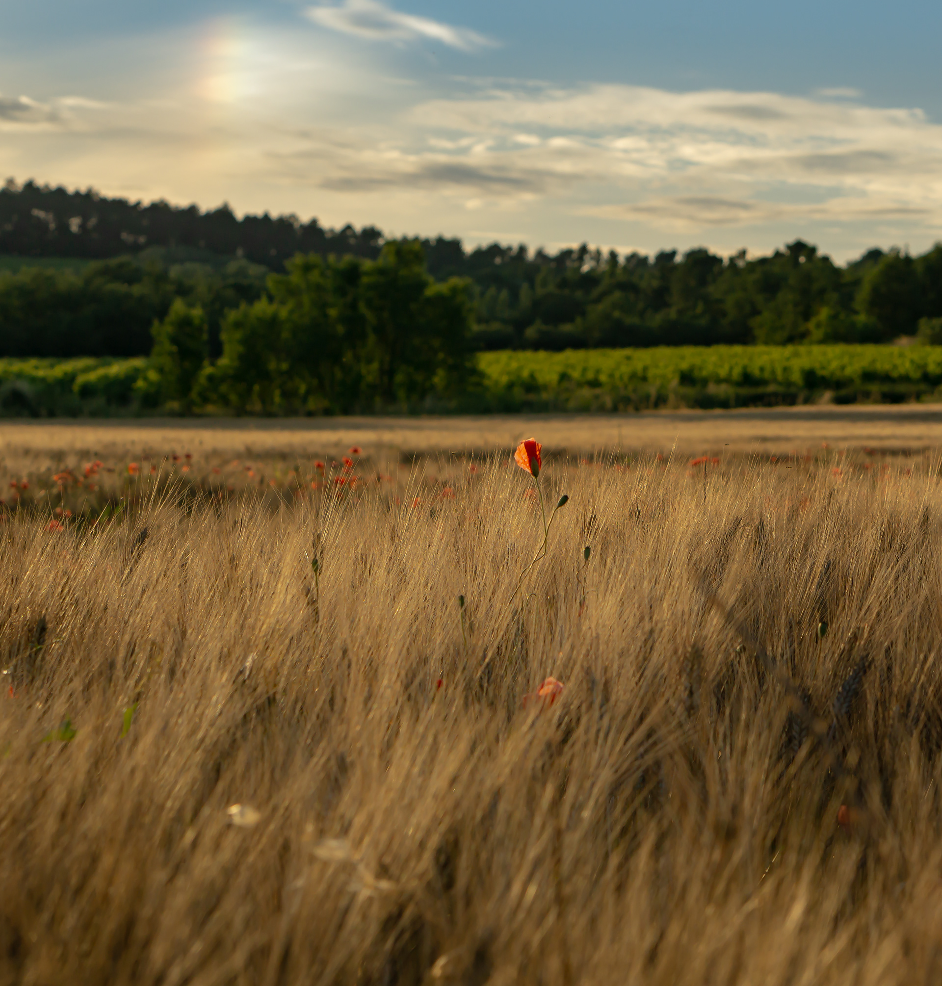 Coquelicots et champ de blé au coucher du soleil